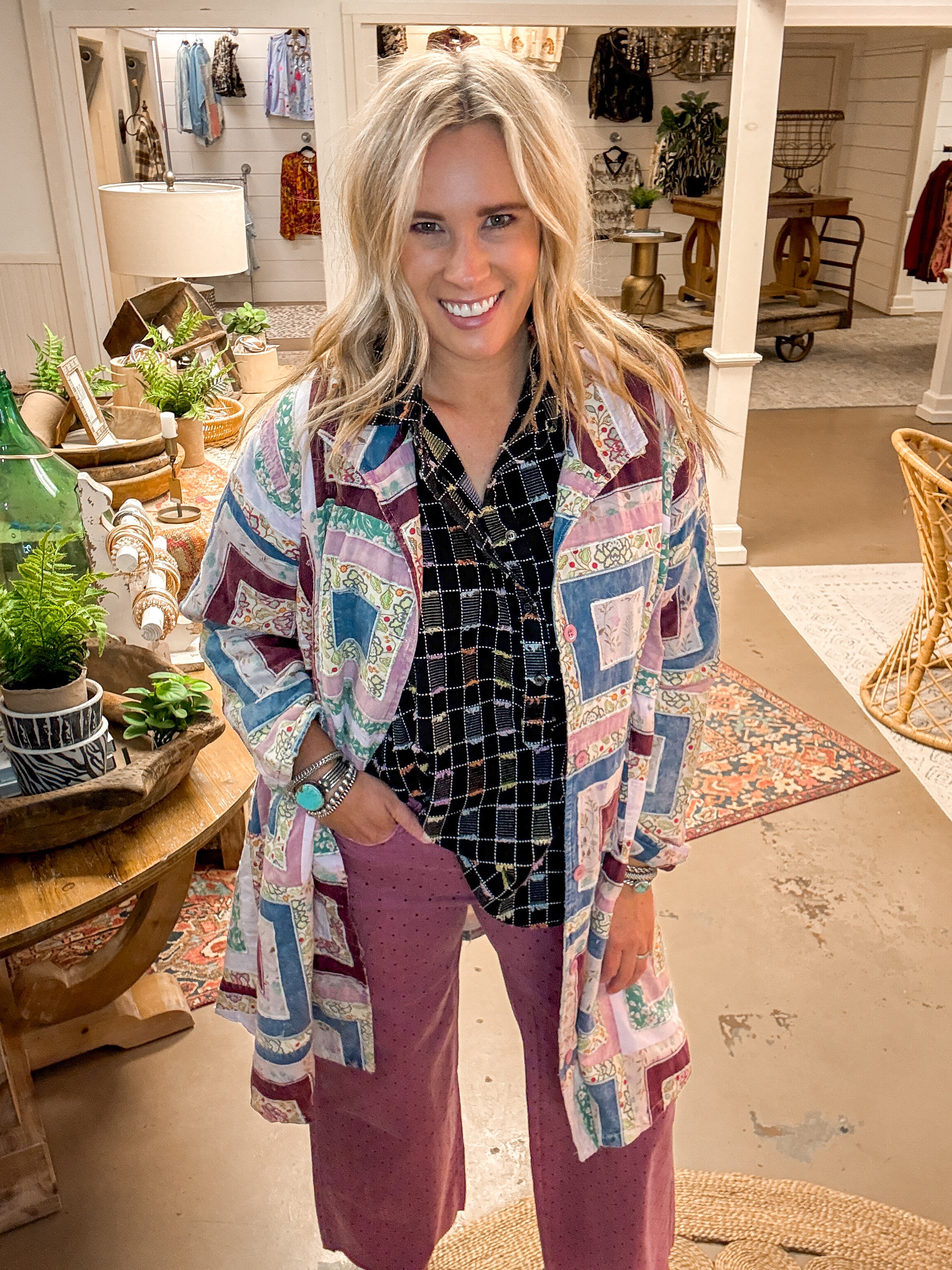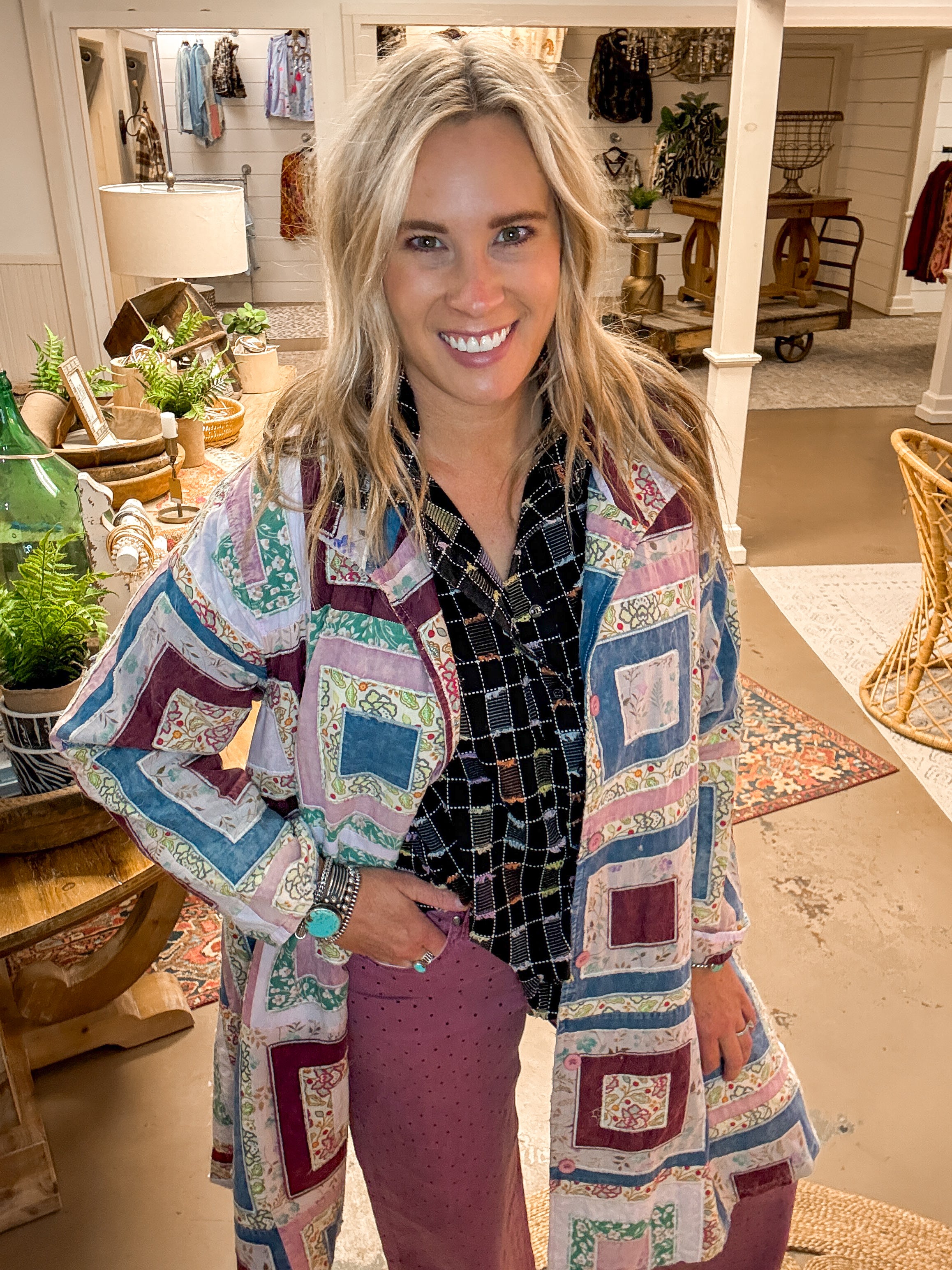 One of my favorite items of the year! This quillwork jacket features a button front, longline style, oversized fit, side slant pockets, single breaded collar, four button front, mineral wash,...