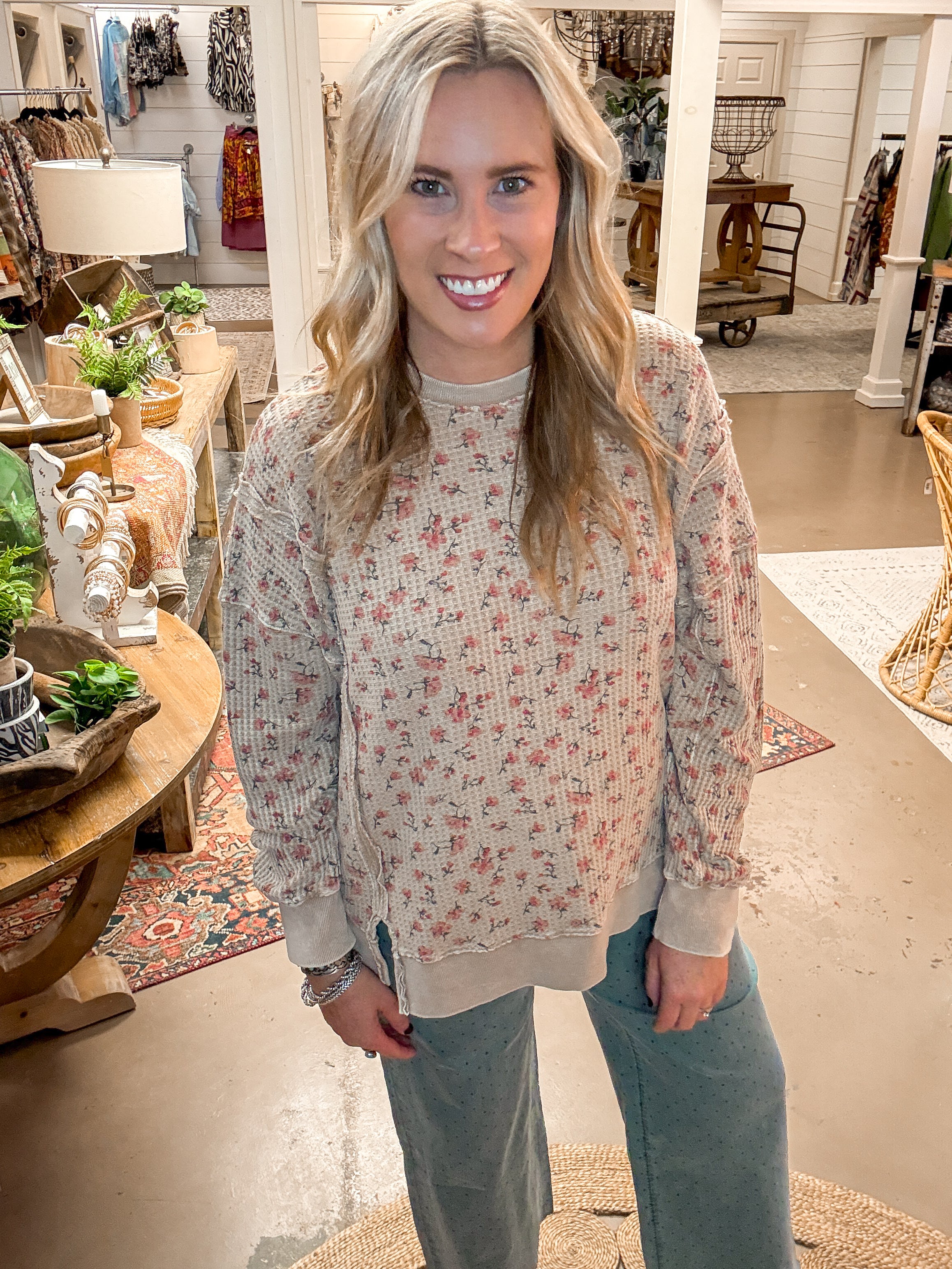 FLORAL PRINTED TERRY PULLOVER SHIRT, CHOCOLATE