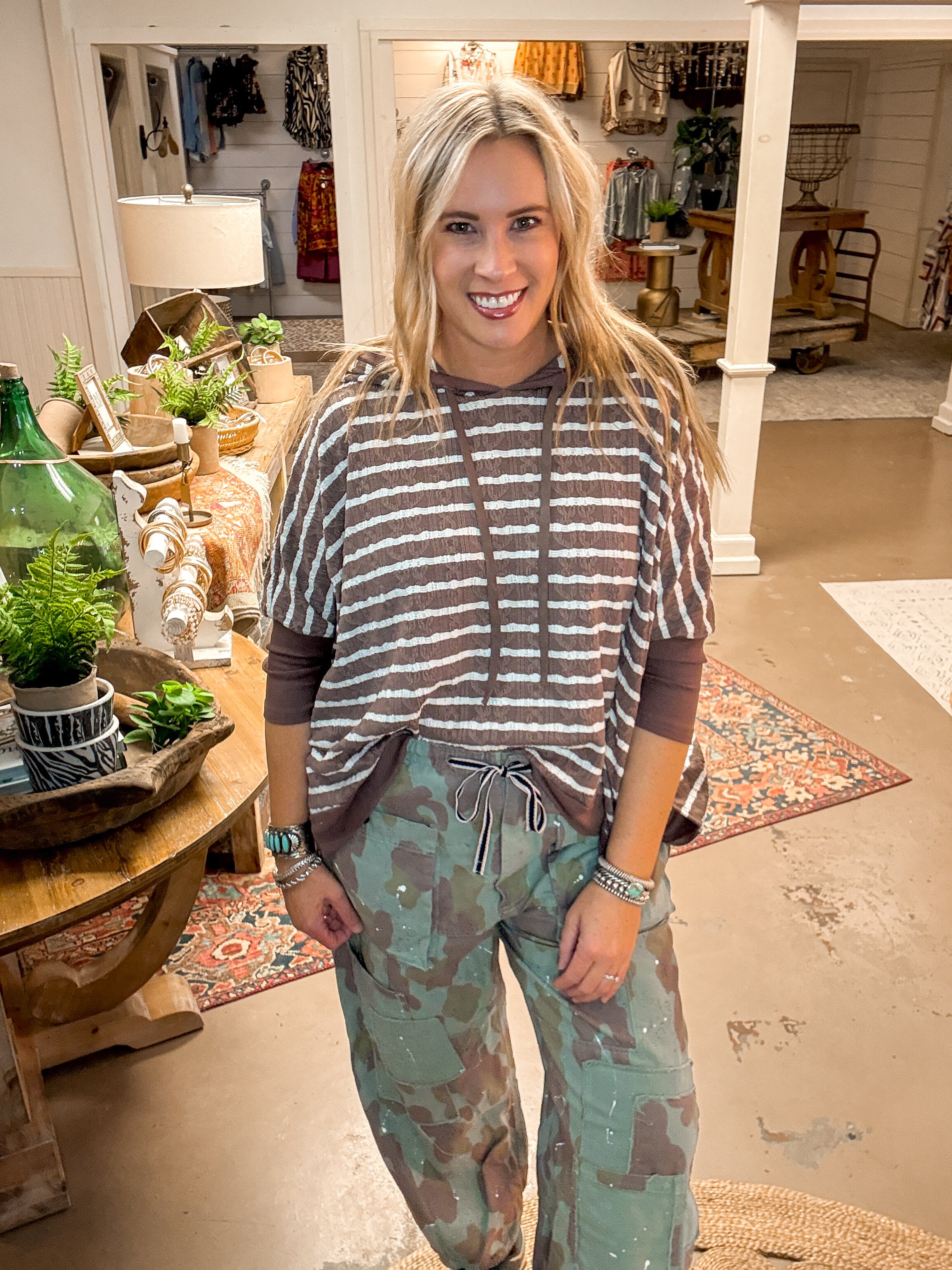 The hooded top every woman needs! This textured pullover features an allover horizontal stripe pattern, drawstring hood, dolman/batwing sleeves, long ribbed cuffs and hemline, side slits at hem, and 3/4...