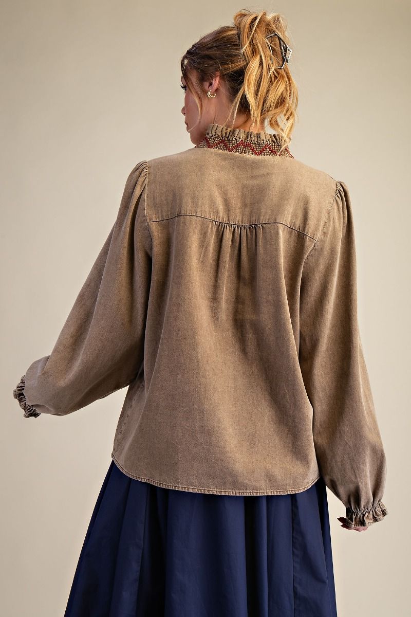 This top can be taken so many directions - western, feminine, preppy. This washed twill top features a v-neckline with ruffle trim, embroidered contrast stitching, long puff sleeves, relaxed fit....