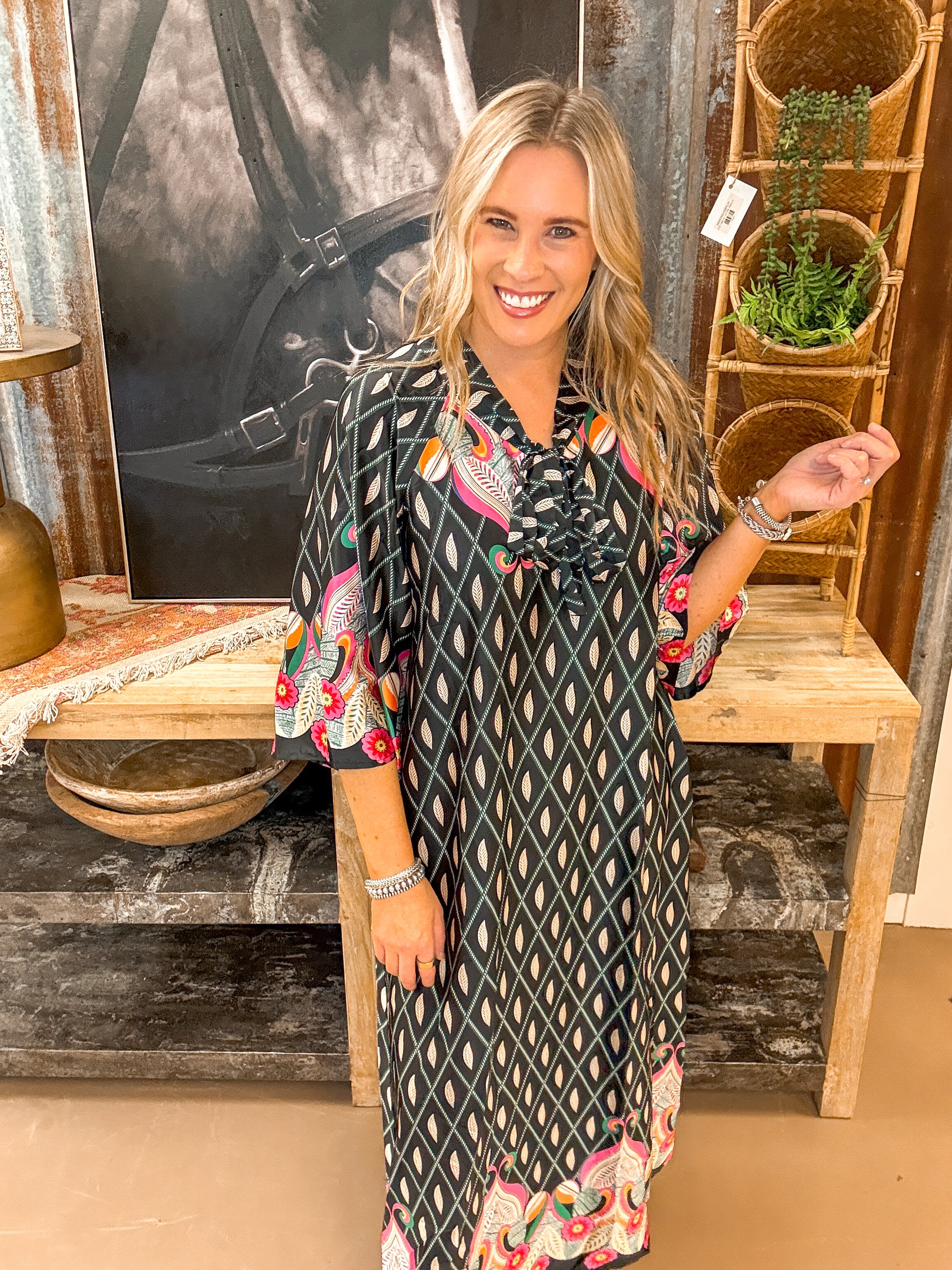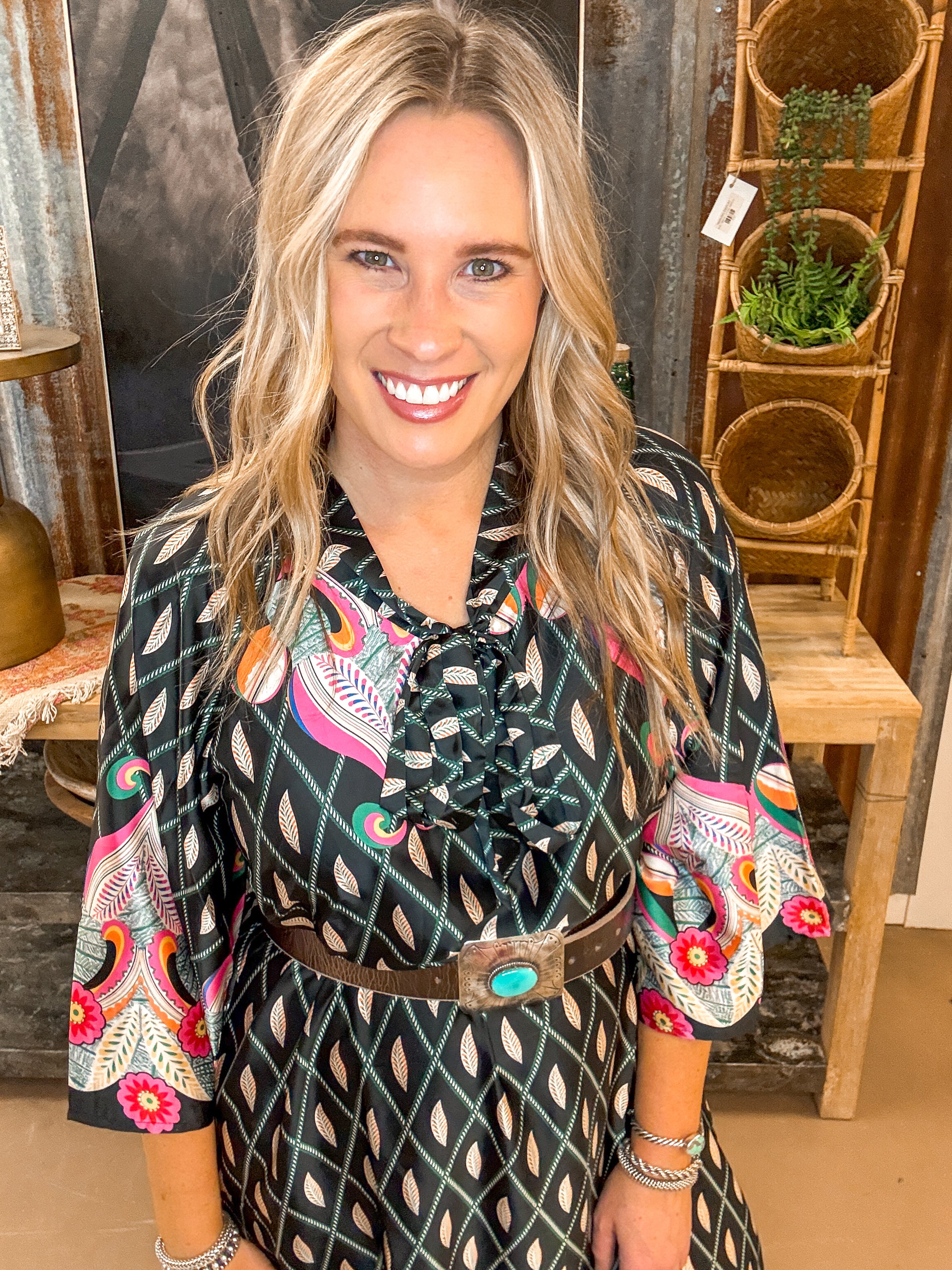 This one is an absolute stunner! This blouse features a border print, balloon sleeves with smocked cuffs, dropped shoulders with ruffle accents, v-cut and ruched neck with tassel tie closure,...