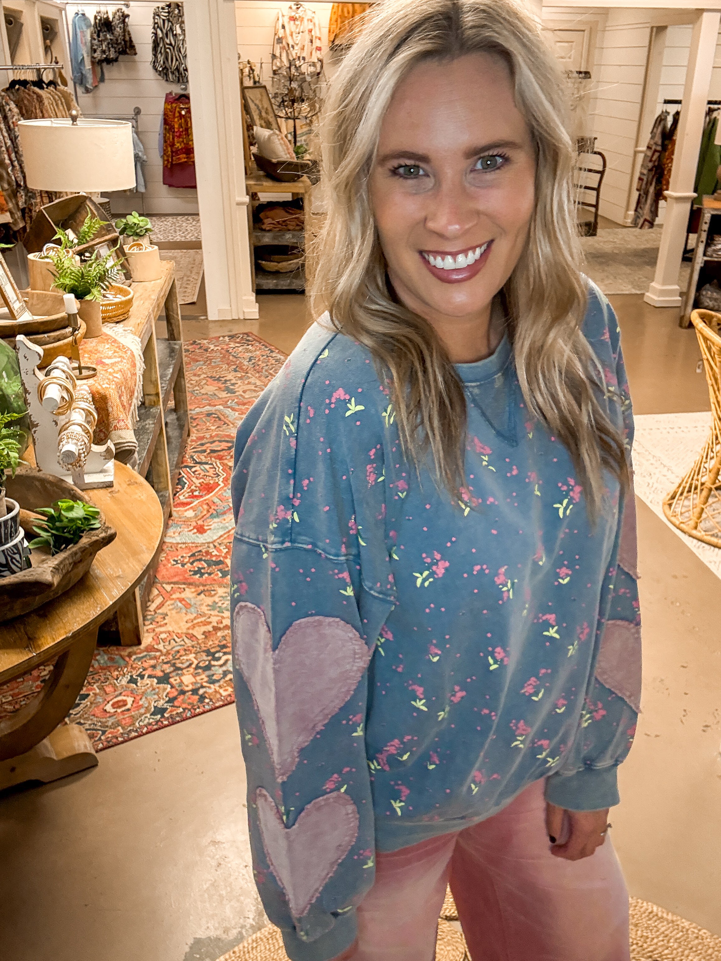 The definition of "transition to spring"! This lightweight sweater features long balloon sleeves, rounded neckline, ribbed cuffs and hem, dropped shoulders, striped pattern, textured flower patch detailing, relaxed and loose...